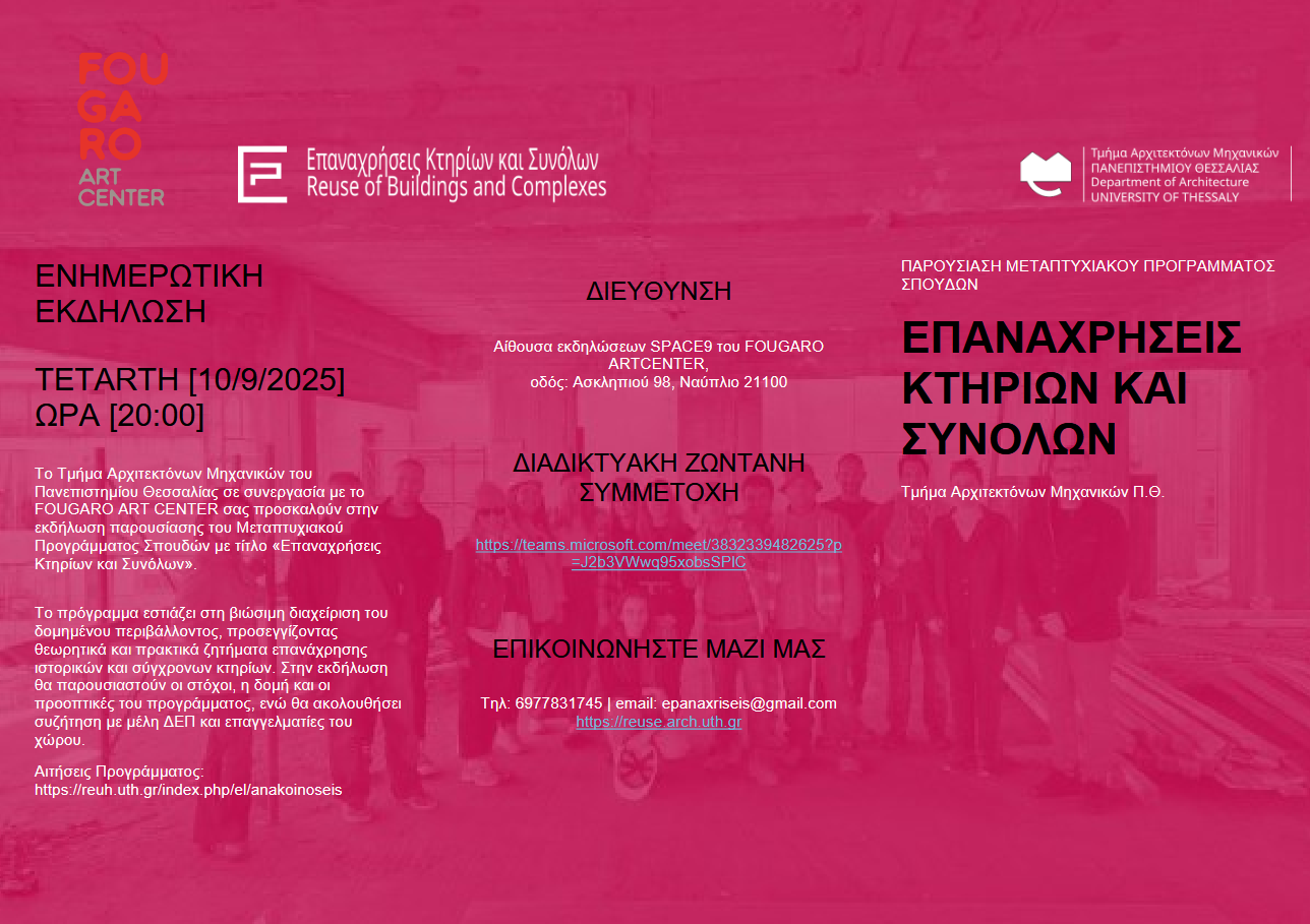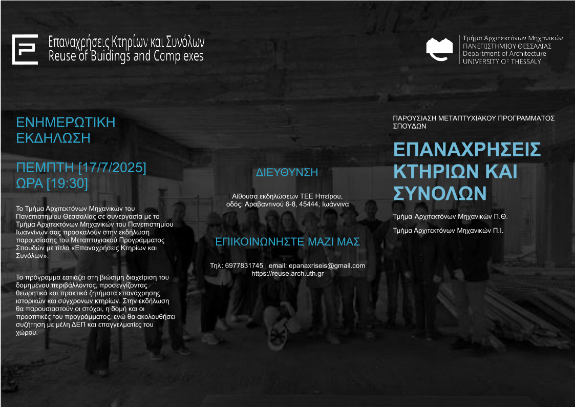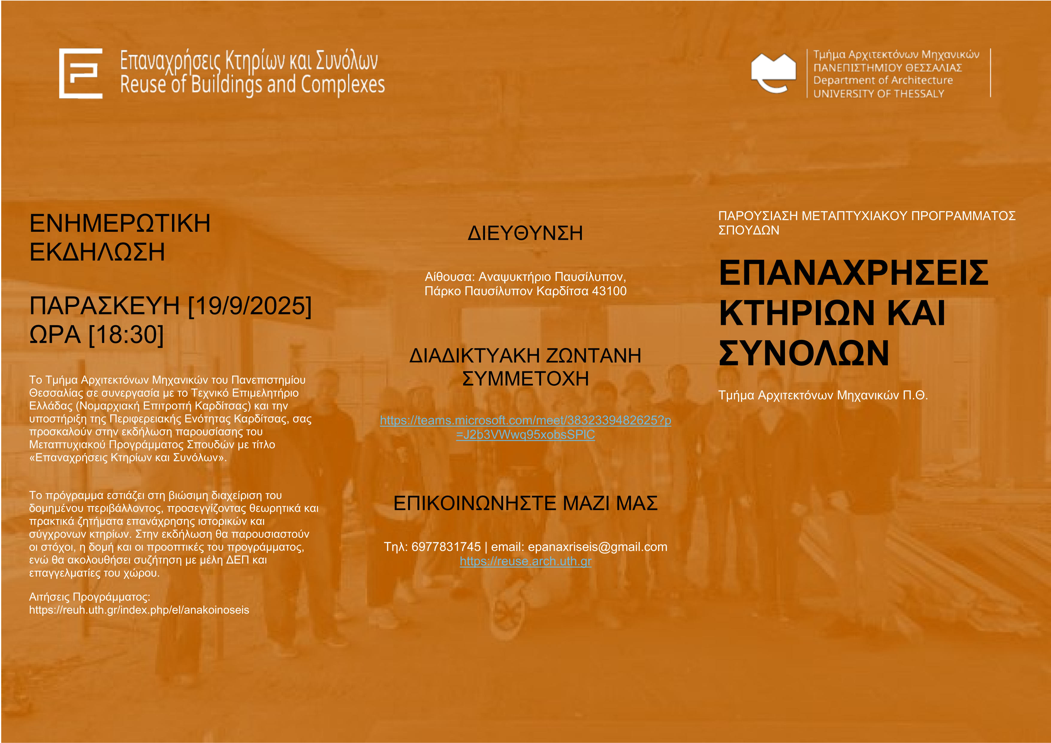 ΠΜΣ Επαναχρήσεις Κτιρίων και Συνόλων Διάλεξη της Sally Stone: The Future of the Already Built Πέμπτη 11/12/2025, 16:00 Σύνδεσμός μέσω το MS Teams Στο πλαίσιο του μαθήματος Σύγχρονη αρχιτεκτονική σε παλιά κτίρια και ιστορικά σύνολα του Π.Μ.Σ. Επαναχρήσεις κτιρίων και συνόλων, την Πέμπτη 11/012/2025 στις 16:00 [UTC+3] θα πραγματοποιηθεί η διαδικτυακή παρουσίαση της Sally Stone, Manchester School of Architecture, με τίτλο “ The Future of the Already Built”. |